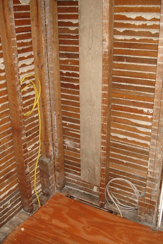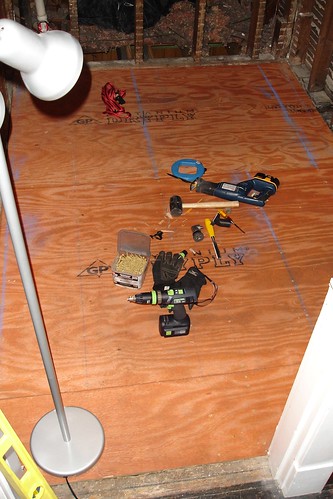 The last two pieces of the subfloor went in today, after a good deal of measuring and fitting. The final piece took quite a bit of very slight alteration to get into place, but that’s to be expected. Our reward for all that hard work is the foundation for the new bathroom.
