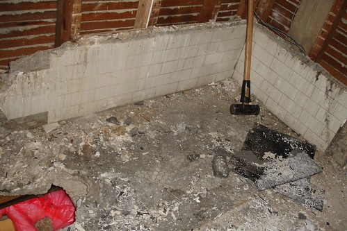Yesterday evening marked the official start of the project, and my friend Jeremy came over to help with more demolition. We very easily removed the vanity, and the shower partition wall, which left just one more thing… the tub. A cast iron beast, original to the house, and far too heavy to remove in one piece. So several hours with a sledgehammer later…