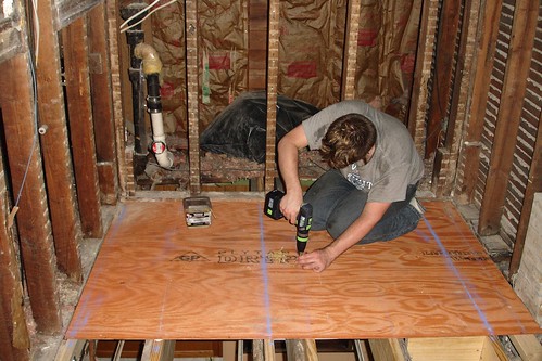 With all of the blocking in place, we were finally able to get the first piece of subfloor in place! It went in relatively smoothly, with only a few notches being necessary to work around some rougher framing in the corners of the room. I got to make good use of the depth-stop chuck for my new drill, which made driving all the screws incredibly easy.