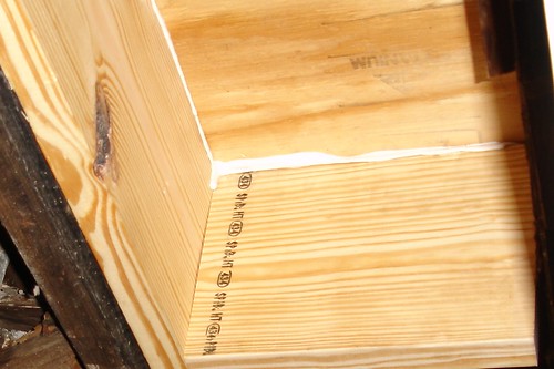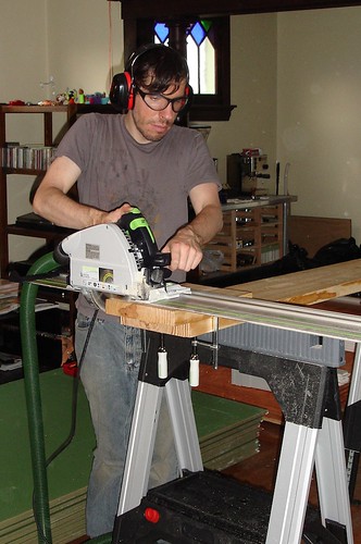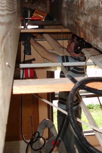 Most of today was spent cutting and fitting blocking to give the floor and joists a bit of extra support. It was very tedious work, since we had to rough cut each piece, then scribe and transfer lines for the exact angles needed to fit in between the not-quite-square joists. But it did give Brad some good quality time with the circular saw.