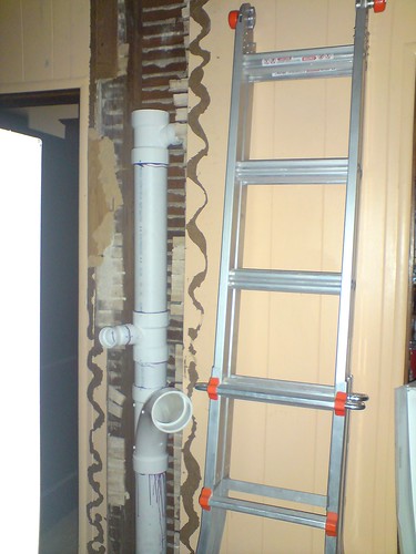 I spent the rest of Wednesday getting the lower half of the new drain stack pieced together. Right now, it is being held up by a stepladder in the basement, waiting to be raised into place and hooked up.