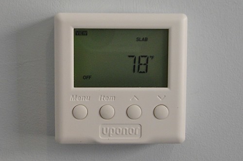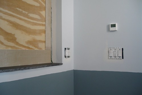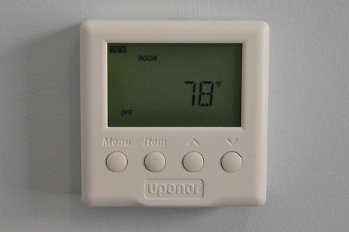 I also spent some time today installing the thermostat for the radiant floor. I still have some work to do in the basement on getting everything hooked up for the controls, as well as all of the plumbing for the heat, but at least the thermostat is powered and connected to the floor sensor. It’s interesting to look at the two temperatures throughout the day and see how they vary. In the morning, the floor was colder than the room; now in the evening, it’s reversed. I apparently snapped these pictures right as they converged.