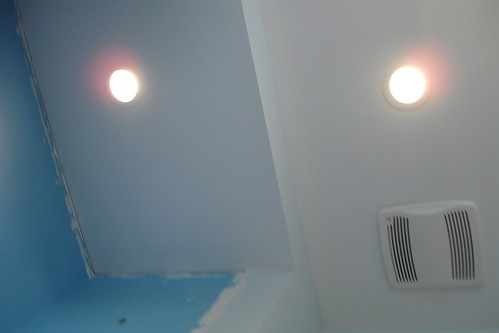 With all of the painting done, I was able to start installing some of the more basic trim, including the trim kits for the recessed lights and exhaust fan. I started to install the cover plates for the light switches, but discovered that I’d made a mistake when mudding the drywall, and hadn’t closed in the boxes enough. So I had to pull back out the joint compound, and it will be a few more days of getting those properly surrounded so there won’t be any big gaps.