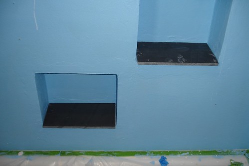 I then spread some thinset in each niche and back-buttered each piece of slate, since they are irregular. Once they were set in, I did a quick check for level from side-to-side, and made sure they were all pitched slightly lower in the front, so any water will flow out. Once they’ve set up by morning, we’ll give them a good cleaning, followed by a coat of sealer. Then we’ll be able to start installing the rest of the tile in the niches, and then on to the shower surround! It won’t be long now…