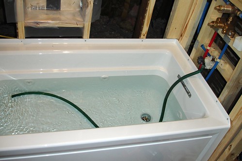 You may notice that I’m using a garden hose, instead of the traditional tub filler. I happen to have an extra hose spigot lying around, so I just threaded that into the drop ell connection for the tub filler, instead of temporarily installing the nice, expensive shower trim. And it worked! The only leak was because I skimped on thread sealant for the spigot, since it was a temporary installation. The rest of the plumbing performed flawlessly, including the tub drain and overflow.