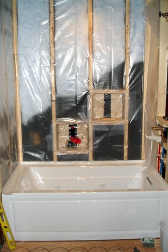 Yesterday, Brad and I spent quite a bit of time marking, measuring, carrying, cutting, and test-fitting the piece of cement board that will have the two niche cutouts in it. It probably would have been easier to piece the layout together from many smaller pieces, but I’d like to keep the number of seams down, since that’s less chance for failure. With the tub tested, we were able to proceed with installing insulation and a vapor barrier around the tub/shower area, and finally, our first piece of cement board!