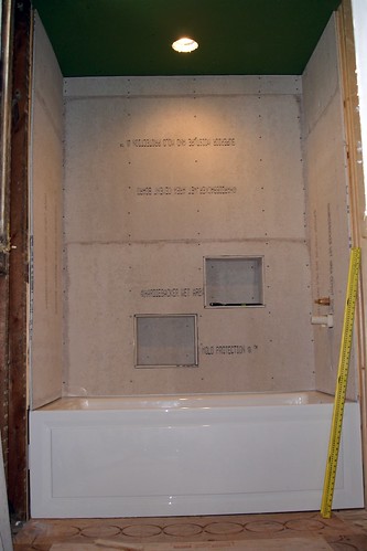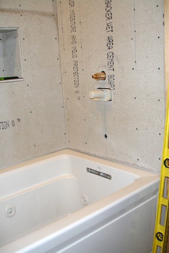 We finished installing the cement board for the tub surround yesterday evening. This included the piece that covers the plumbing wall of the shower, which was by far the most difficult to cut, having a total of four cutouts, each with very minimal tolerances. I actually surprised myself by getting it right on the first shot, especially since we made all the cuts based off of measurements, rather than direct reference marks (i.e. holding the board up to the obstructions).