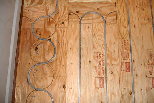 Tonight’s project was to get the tubing installed for the radiant floor, since that is necessary before we can put up drywall. There were a few spots were the tracks in the panels didn’t line up perfectly, so I had to touch them up with the router. Luckily, there weren’t too many, and I didn’t make any (terrible) mistakes.