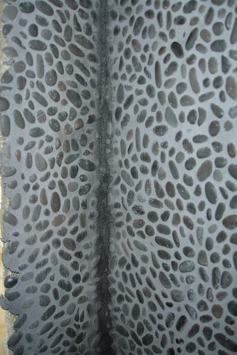 The three niches get their own tile treatment… natural pebble tile with a dark grey grout. Since the top of each niche had to be tiled, and that would have to be supported while the thinset cures, we started there. Tiling upside-down isn’t very fun, but at least we didn’t have too much to do. We used some scrap lumber to make temporary braces to hold the tile up while it sets.