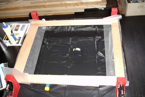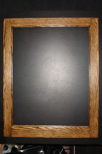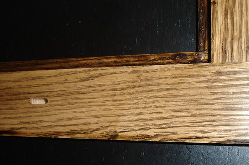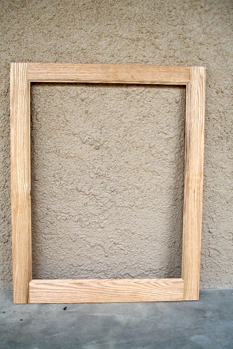 As far as applying finish to the mirror frame, I didn’t take many photos (only one, in fact), but I can run through what I did. Since I used oak, I needed to fill in the pores to get things smooth. I was originally going to use the pore-filling tactic from The Wood Whisperer finishing DVD, but I also wanted to use a water-based finish on the wood, so I wasn’t sure how that would work out.