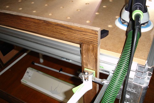 Instead, I used some thinned TimberMate wood filler, which actually worked very well. I then sanded that smooth, and applied General Finishes water-based stain in walnut. Once that was dry, I gave the piece a light sanding with 320 grit Brilliant 2 from Festool, and with the speed on the ETS 150 set to 1. At this point, I was very glad to have bought the MFT/3, since it made sanding the edges a lot easier.