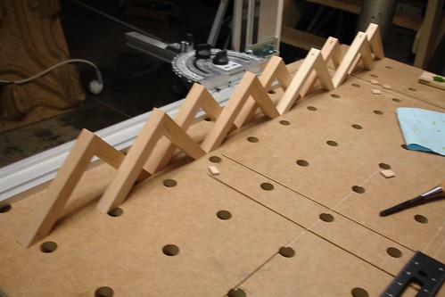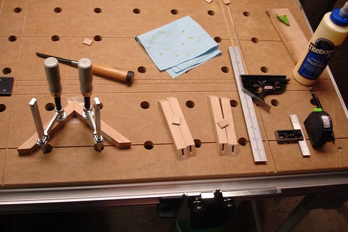 With the brackets assembled, I set about attaching the individual shelves to the back assembly. I decided to start out by mortising the shelf pieces directly into the back. That way, I could install each shelf in its final position, and then mark the actual mortise positions for the brackets, rather than trying to correctly calculate and measure the mortises for each shelf. With all the shelf mortises cut, it was quick work cutting mortises for each of the brackets, followed by a dry assembly to make sure everything was going together properly.