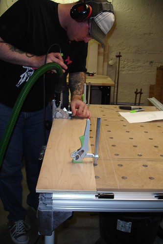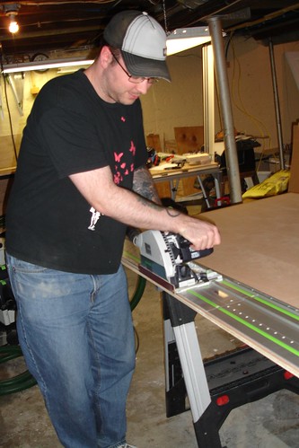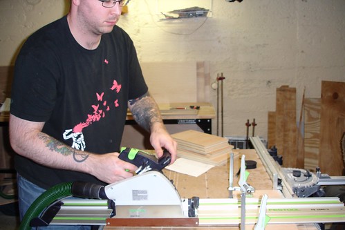 We both liked the design, so with materials in hand, we set about construction. First up the agenda was breaking down the sheet of plywood we had purchased for the project. I let my brother loose to get things cut down to size. Even knowing the accuracy of the TS-55, I was a bit hesitant at first, since my brother has no woodworking experience, but that turned out to be unfounded, and he was soon raving about how nice the Festool saw was.