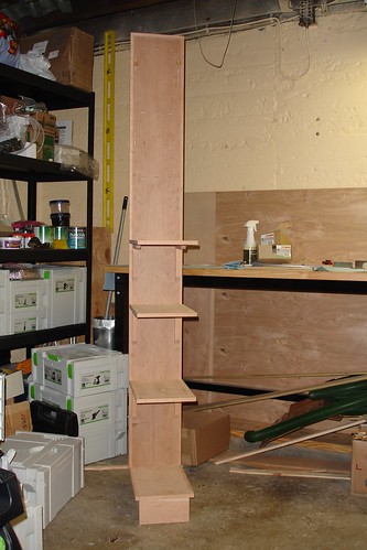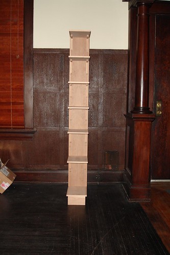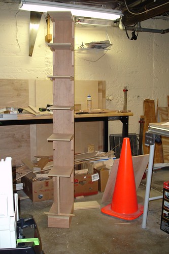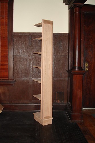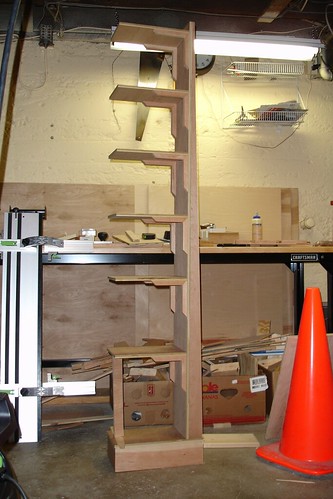 My thought was to use traditional carcase-style construction to build something that, in essence, was a very narrow bookcase. Shelves held in place by two sides and a back. But after returning home, my brother e-mailed me with his idea, and things got a lot more complicated:
