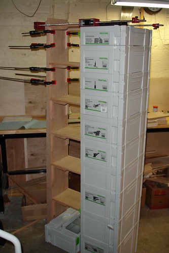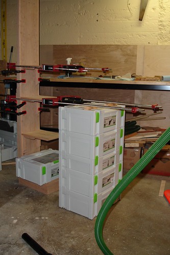 With everything cut down to size, it was time to start gluing things together. The trickiest part of this process was keeping everything upright against the weight of the clamps. Luckily, the system approach came through, using Systainers to prop everything up.