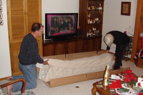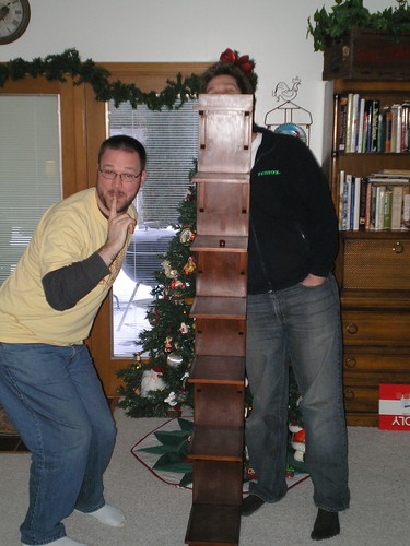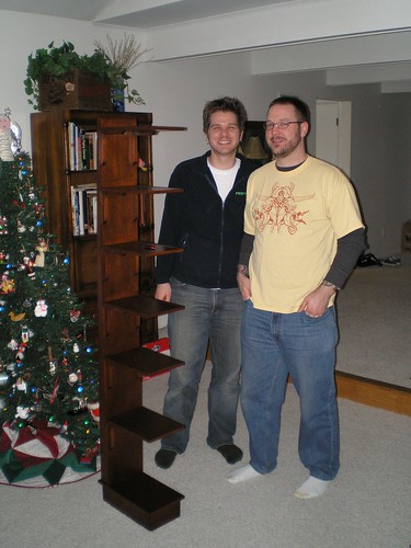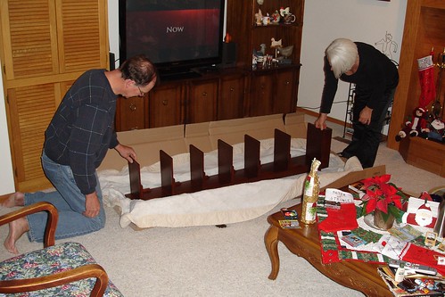 I did manage to part with them, so after packing them up for the trip, my brother and I drove them up to our parents' house, and “hid” them in their basement until Christmas morning. Santa wasn’t able to fit them underneath the tree, so the shelves were just sitting on the living room floor waiting to be unwrapped. I didn’t notice it at the time, but both of our parents immediately started inspecting the finish and joinery.