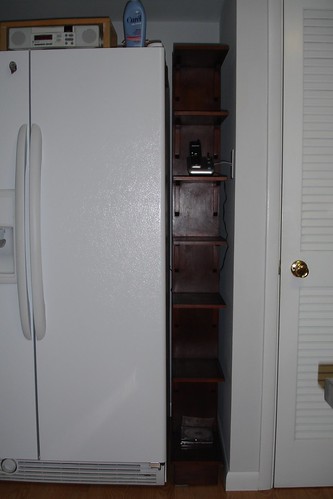 It started simply enough last September. My brother and I made a surreptitious visit to our parents' house in preparation for Christmas. The idea was to build a simple set of shelves to use some otherwise useless space in their kitchen. Our parents had looked in the past for shelves that would fit, and came up empty-handed. With my recent interest in woodworking (and significant investment in Festools), we thought some custom shelves would be a perfect gift. Nothing too fancy, just something able to store a cordless phone and a few other trinkets.