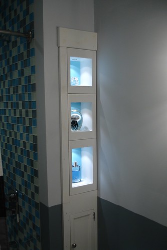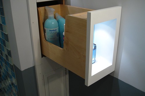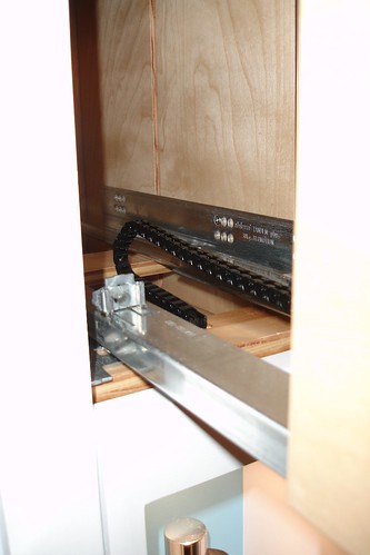 As an added bonus, each of the niches has an LED spotlight in it. Initially, the intent was to have some nice accent lighting in the bathroom, but the niche lights have also turned out to make a rather nice nightlight (being LEDs, each lamp only uses 1 watt). The biggest challenge here was getting power to the lamps while still allowing the drawers to function. Fortunately, the LEDs are low voltage, and use a nice thin conductor. My original plan had been to build a hinged cable arm, much like is sometimes used in sever rooms. After quite a bit of digging around, I found a manufacturer of cable chains that produces them in some fairly small sizes, which turned out to be the perfect solution. The cable for each lamp runs from the fixture, along the back side of the drawer (which is against the wall, so it’s hidden), to the rear of the drawer, where it enters the cable chain. The chain then makes a loop back and attaches to the cabinet near the front. This gives plenty of slack in the chain for the drawer to move freely from closed to fully extended, while cleanly guiding the cable. And without actually removing a drawer, all of the mechanism is completely hidden from view.